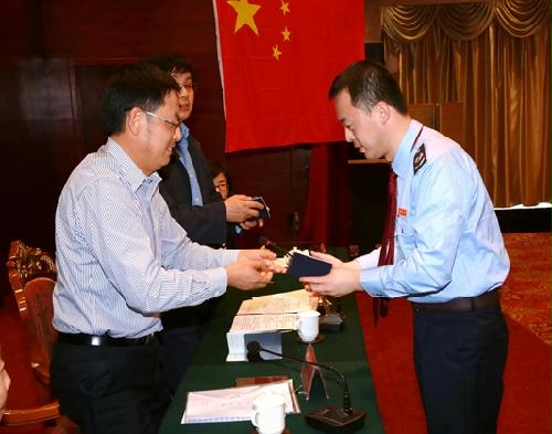 图为 省局政策法规处处长徐怀庚向5名同志颁发第二批公职律师证书